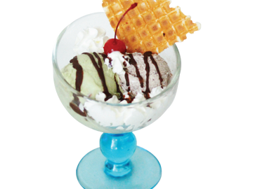 All cups are topped with whipped cream, a strawberry, smooth chocolate sauce and served with a fan wafer!